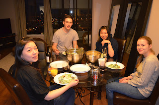 Pizza Party @ Quinn's: I couldn't believe that we would be having a party before the exam! Thanks Quinn and Matt for inviting. They had made so many pizza doughs for us. We basically just paired up, then rolled and put toppings of our choices on our own dough. It was a competition, but I still think the one Dina and I made looked.... the best.... LOL Cynthia and Cindy tried to make a heart shaped dough... didn't know why. We had very garlicky ceasar salad, and home made cookies by our host. Then we played card game, what a night! Thanks again, Quinn and Matt.